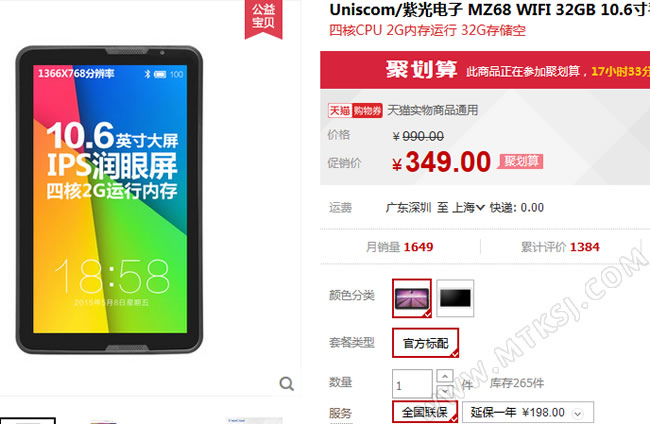 紫光电子7月份推出的10.6英寸WIFI平板MZ68最近就迎来了超低报价,这款拥有大内存、大屏幕的产品当前正在天猫优惠促销。 ![]() 聚划算平台上,只需要349元就能入手这款10.6英寸大屏幕的平板产品,虽然价格和其它商家没有拉开太明显的差距,但是活动期间购买紫光MZ68不仅有349元的超低价格,还能得到耳机、数据线以及原装充电器和延保等服务,晒单还有皮套赠送。 本文来自MTK手机网http://www.mtksj.com 如此低到不敢让人相信的价格,你或许为这是一款规格很低的平板电脑,事实恰好相反。紫光MZ68在某些地方比之大部份10.1英寸平板更为给力,内存容易尤其吸引眼球,这款平板采用了2G RAM+32G ROM大内存组合,10.1英寸的IPS屏幕采用了1366*768的分辨率,另配备了全志A33四核1.3GHz主频率处理器,支持WIFI联网以及蓝牙功能。 除去上述规格,紫光MZ68采用了6000mAh电池、Android 4.4系统以及30万/200万像素摄像头,并有双扬声器配备。 这款10.6英寸的巨无霸产品提供了黑、白两种颜色,外形较为圆润,没有居中设计的扬声器显得极为个性,并且紫光MZ68还提供了双3.5mm耳机孔。 本文来自MTK手机网http://www.mtksj.com ![]() 紫光电子MZ68实拍 转载MTK手机网原创文章请保留链接:10.6英寸/2G+32G内存 紫光MZ68只需349元 |