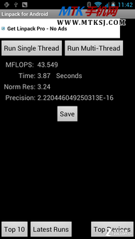 Neocor图形性能测试/支持5点触控 本文来自MTK手机网http://www.mtksj.com Linpack 本文来自MTK手机网http://www.mtksj.com 用高斯消元法求解一元N次稀疏线性代数方程组的测试, Linpack国际上已经成为最流行的用于测试高性能计算机系统浮点性能的benchmark通过利用高性能计算机。评价高性能计算机的浮点性能。相对电脑而言,Android手机版的Linpack软件相对简化了一些,最新版只包括单线程与多线程两种测试。顾名思义,处置器的运算能力越强,分数就越高,双核甚至未来的多核处理器的优势,多线程测试局部来有所体现,测试结果以浮点运算每秒(Flop给出。 本文来自MTK手机网http://www.mtksj.com