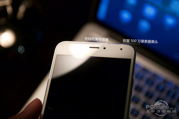 正面采用2.5D屏幕,玻璃质感很明显。正面上方从左到右分别为听筒、光线距离传感器和前置500万像素摄像头。
