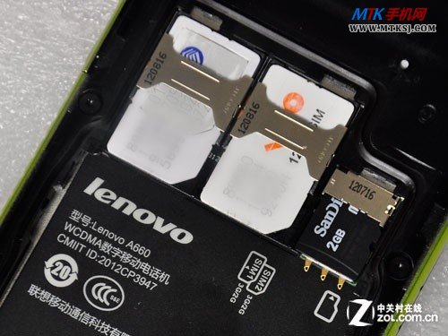 另外在内仓中的电池上方还能够看到并排排列的3个卡槽,包括两个SIM卡槽和一个micro SD卡槽。联想乐Phone A660能够支持WCDMA+GSM网络双卡双待,两个SIM卡槽都能够支持WCDMA网络。 本文来自MTK手机网http://www.mtksj.com