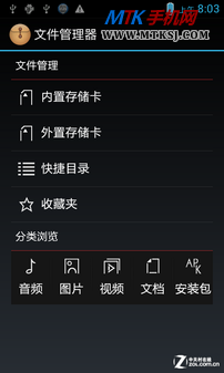 另外,联想乐Phone A660对“文件管理器”的处理还是比较分类清晰的,这对于经常找不到个人资料的用户还是比较使用的。其中内置、外置存储卡清晰注明,音频、视频、图片、文档和安装包也具有清晰的自动分类,查找时根据文件属性很方便。 本文来自MTK手机网http://www.mtksj.com