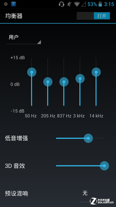 多媒体播放方面,中兴U956支持播放AAC、APE、FLAC、OGG等格式的音乐,支持均衡器手动调节,同时在下拉菜单中也可以对播放中的音乐进行控制。