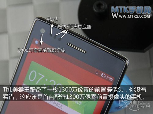 屏幕上方设有一枚1300万像素的前置摄像头,这应该是市面上第一台配备1300万像素前置摄像头的手机,另外前置面板还隐藏了一颗状态指示灯,充电、有未看信息、未接来电的时候,指示灯都会有相应的灯光提示。 本文来自MTK手机网http://www.mtksj.com