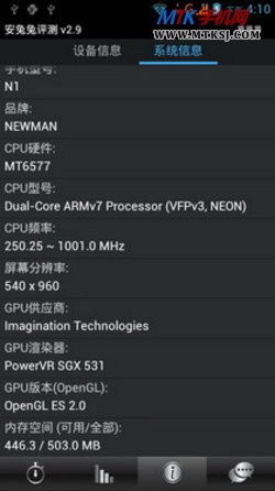 纽曼N1设备信息 本文来自MTK手机网http://www.mtksj.com 首先,用安兔兔评测软件来测试纽曼N1的综合性能,安兔兔评测软件是一个专门给Android系统的手机、平板电脑硬件跑分的软件,它能一键运行完整测 试项目,通过内存性能、CPU整数性能,CPU浮点性能、2D、3D绘图性能、数据库I/O、SD卡读、写速度等多项性能测试,并对手机的整体和单项硬件 性能做出评分。同时上传分数并查看该设备在世界的排名。 本文来自MTK手机网http://www.mtksj.com ![]() ![]() Neocore是一个基于OpenGL-ES 1.1的图形性能基准测试软件。软件打开后会播放一段动画,在动画的最后软件会对运行软件的机器进行评定,并得出一个FPS值。该数值越高,则表示手机硬件对于动态图像的处理能力越强。 本文来自MTK手机网http://www.mtksj.com ![]() ![]() 从以上的测试结果中,我们已经能看出,纽曼N1安兔兔评测软件成绩为5207分,Neocore软件测试成绩为59.3FPS,还支持同时五点触控。在千元的手机中,综合性能已经十分出色。文件读写速度,2D和3D图形处理能力足以满足用户的需求。 本文来自MTK手机网http://www.mtksj.com