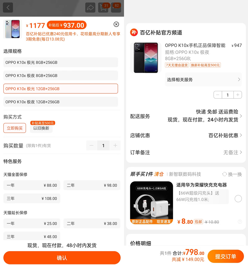 国内知名的大型电商平台某宝里,OPPO K10x已出现了打上市以来的历史最低价格,这款手机的8+256G版只需798元即可到手,顶配12+256G版亦仅937元!并且当前配色依旧齐全,不过享受这一优惠价格的前提是——需要用户通过百亿补贴频道下单。