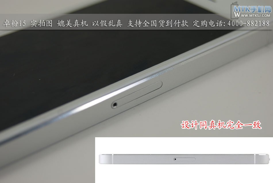 官方放出的实物拍摄图片,与水果5的对比: 本文来自MTK手机网http://www.mtksj.com 机身背部特写 ![]() 摄像头部份对比 ![]() 机身顶部对比 ![]() 前置摄像头部份对比 ![]() 手机底部数据线以及耳机等部份的对比 本文来自MTK手机网http://www.mtksj.com ![]() 左侧音量键位置对比 ![]() 右侧设计 ![]() ![]() 测试卓粉I5宽度约58.6mm 本文来自MTK手机网http://www.mtksj.com 高度约为123.8mm ![]() 机身厚度也做的非常好,同样仅为7.6mm。 除了机身各个部份差异极小之外,卓粉I5同样可以使用水果5的后盖,再次感叹一下国内“山寨”功底的深厚。众所周知,这一次水果5更换了数据线,而数据线接口问题也是困扰了诸多山寨厂商开发高仿水果5进度的原因。 ![]() 此次卓粉I5官方网站也正式公布了I5的相关配置,将搭载MTK6577双核1G处理器,内存部份采用主流的1G RAM与4G ROM组合,并配置了16G的扩展存储,4.0英寸的屏幕,分辨率为854*480 FWVGA级别,采用了前后双摄像头,主摄像头像素为800万,此前公布的信息显示,卓粉I5的电池容量为1400毫安。 本文来自MTK手机网http://www.mtksj.com 卓粉I5试用视频: 编辑点评:当众人以为卓粉I5会难产的时候,卓粉I5却突然出现了,并且正式开始发售,相比之很多只见雷声不见下雨的产品,卓粉I5也算是快人 一步。 转载MTK手机网原创文章请保留链接:高仿水果5卓粉I5上市售价1499元 (整理:admin) |