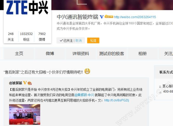 关注国产智能手机的机友想必都知道,从JDPhone计划开始,中兴与京东的合作越发深入,于1月中旬两者签署了巨额战略合作协议,将就终端产品和通信服务展开合作,数日前两者再次联手推出“售后到家”新政,凡购买了中兴手机产品的用户,产品出问题均可享受到上门取件的服务,售后更加便利。 日前@被屏蔽透露,中兴与京东的合作远不止于此,下个月也就是4月份,中兴、京东将联手推出更具“互联网思维”的手机产品,并称“设计、功能、体验”等会有惊喜,并有接地气的价格! 其实在与京东签下35亿合同的时候,中兴官方已经确认稍后将有”浓厚互联网色彩“的青春系列手机登场,如果不出意外,4月即将亮相的新机或许就是其中一员,是否是前不久传出的799元中兴八核手机暂且没有答案,不过既然称作是“大招级手机”,想必各方面不会让网友失望的了。 本文来自MTK手机网http://www.mtksj.com 前不久中兴在京东商城首发了目前仅有的两款电信八核手机-青漾2与Memo II,这两款产品的价格等方面都中规中矩,属于全渠道发售的机型,显然并非提倡“3C”互联网思维的中兴互联网手机,随后到来的神秘产品才是中兴通讯终端改革之后的真大招!一起拭目以待吧! ![]()