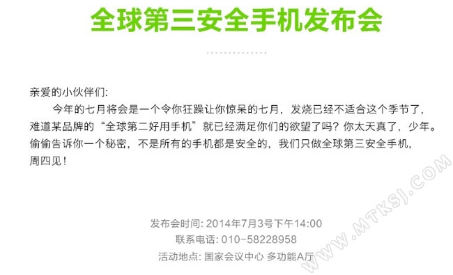 另一方面,青葱手机的新款产品也蓄势待发,正式发布时间终于揭晓,新机发布会将在7月3日于北京进行。 ![]() 这款手机之前已有少量的消息曝光,特色卖点之一是支持4G全网通,联通、移动以及电信三种4G网络通吃,卖点之二是有神秘的操作系统加入。关于新品,日前有了更明朗的消息,青葱新机将主打安全,号称“全球第三安全手机”,将给用户一个安全的使用环境,显然会在系统方面发力。 本文来自MTK手机网http://www.mtksj.com 说到安全,可能很多网友都会联想到同洲不久前发布的960 OS,官方称960 OS系自主花9年时间研发,提供系统级防护,从底层保护手机信息安全。青葱手机可能会与同洲合作,青葱新品将搭载960 OS,用安全做为自身的特色卖点。 ![]() 再者前不久曝光了一张青葱新机的谍照,机身正面的设计和同洲首款安全手机960E十分相似,或许青葱新机就是960E的定制版,也意味着该机会采用骁龙400处理器、5.5英寸1080P屏幕和2G RAM/16G ROM、1300万像素SONY堆栈式摄像头等配置。 本文来自MTK手机网http://www.mtksj.com 这仅仅只是一个猜想,真相将在本周四(3日)下午2点揭晓,如果真是售1888元的960E的定制版,你觉得向来以价格开路的青葱手机会给新品定出什么样的价格? 转载MTK手机网原创文章请保留链接:青葱4G新品3日发布 全球第三安全手机? |