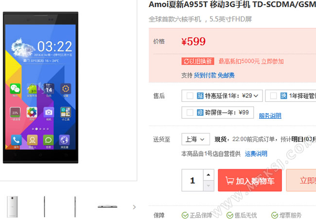 夏新A955T去年下半年逐渐退出市场,淡出人们的视线,现在这款手机再度重返国内市场,并且给出的价格十分具有吸引力,该机在1号店仅需599元! 如果你了解这款产品的话,会发现如今这个价格是比较给力的,基础配置部份,夏新A955T是全球首款内置联发科MT6591六核处理器的产品,主频率为1.5GHz,集成了Mali-450mp4图形处理器。屏幕规格不凡,5.5英寸1920*1080的IPS屏幕,并采用了OGS全贴合技术,拥有2G运行内存和8G存储空间,拍照则较为普通,前置为200万,搭载800万像素主摄像头。另有2500毫安电池、定制的Android 4.4系统,支持TD-SCDMA/GSM双卡双待,拥有电子罗盘等传感器和OTG等功能。 本文来自MTK手机网http://www.mtksj.com 这款产品出色的地方还有屏占比,配备了5.5英寸屏幕的前提下,该机将尺寸做到了148*74*7.8mm,不仅厚度较薄,边框控制亦非常给力,整体造型则偏向于方形,给人硬朗之感。 就该机大部份规格而言,放到当下也不算落伍,遗憾的是夏新无心发力64位与LTE,不然对A955T小升级一下仍是一款不错的产品。 ![]()
