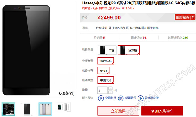 拥有超高配置、整合了流行指纹识别功能的锐龙P9无疑是神舟手机史上真正的旗舰手机,因此这款手机的价格最贵,双11首发价格为1999元,然而锐龙P9也仅仅只是在双十一期间发售,后续一直是无货状态。 日前,神舟手机官方旗舰店再度上架了这款旗舰级手机,目前能够现货购买,有白色、深灰色两种版本,但是需要注意的是--此时到来的锐龙P9价格有调整,当前不再享受1999元的首发价格,而是恢复了原定的市场价,直涨500元售价为2499元。 采用了超大号超高清显示屏是神舟锐龙P9的核心卖点之一,该机配备一块6英寸的屏幕,搭配的分辨率为2560*1440,是国内为数不多已上市的6英寸2K屏手机。另者,锐龙P9采用MT6795/helio X10+3G RAM/64G ROM高配组合,性能有保证,拍照部份则选择了2070万像素主摄(SONY IMX230传感器/PDAF对焦/4K视频录制)+800万前置的搭配,拥有3850mAh电池,支持双4G双卡双待和指纹识别等功能,系统基于Android 5.0定制。此外,锐龙P5还采用了流行的金属机身。 本文来自MTK手机网http://www.mtksj.com 或许是神舟进入手机市场时以性价比策略开路的原因,在千元产品疯狂涌现的当前,锐龙系列并没有带来足够大的惊喜,虽然锐龙P9首发1999元的价格并不离谱,但是首发没有获得太高的销量,此次恢复市场价格重新登陆线上发售,不知道会有多少网友买单呢? ![]()