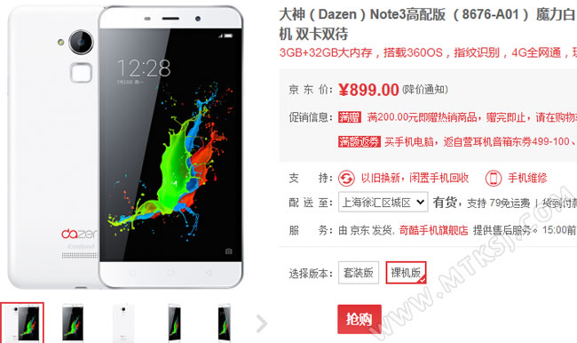 在官方商城以及相关旗舰店,大神NOTE3高配版目前仍是以抢购模式发售,最近的一轮预约抢购是2月16日。在此之前,2月4日大神NOTE3高配版在京东商城现货抢购中,同时移动官方商城无需抢购,也有现货供应。 让人注意到的是大神NOTE3高配版除了在售的标配裸机版本,新增了一个套装版,套装版包括裸机版的所有内容,但另外会赠送移动电源和耳机,价格小贵百元,售999元, 有配件需求的网友可以考虑这一版本。 作为大神手机今年初新一代入门级全网通指纹机的代表之作,大神NOTE3高配版不仅有指纹识别、全网通、5.5英寸HD屏、MTK MT6753八核处理器、1300万像素摄像头、3000mAH电池等,还有3GB运行和32G大存储空间,并且出厂就预装了360 OS,是当前899元档值得选择的一款产品。 本文来自MTK手机网http://www.mtksj.com ![]()