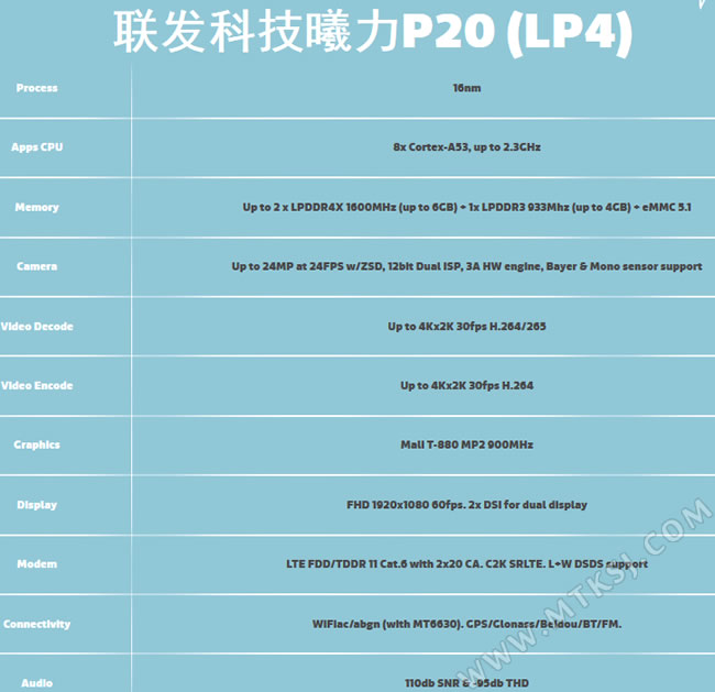 通过Helio P20的整体资料不难发现, helio P20继续遵从“让轻薄型产品更省电,并带来更强性能和丰富功能”这一产品理念,对比P10,P20带来了更多的改变,用官方的话说,helio P20功耗更低、性能更强劲并有强大的多媒体功能。 本文来自MTK手机网http://www.mtksj.com 首先,helio P20在制程工艺上带来了升级,它虽然仍旧是八核Cortex-A53架构处理器,但是却采用了16nm工艺, 更先进的工艺将是helio P20更省电的基石之一,而高达2.3GHz的主频率则会保证CPU性能。其次,helio P20的内存规格也有提升,它是全球第一款能够支持双通道LPDDR4X规范的手机SOC,LPDDR4X仅0.6V的供电电压直接降低了P20达25%的功耗(相对于P10而言),最高6GB,兼容LPDDR3(最高4GB),支持eMMC5.1存储标准。 多媒体部份,helio P20整合了ARM Mali-T880MP2 GPU,主频率高达900MHz!新升级的图形处理器赋予了P20更强大的多媒体性能,能支持30fps 4K视频播放录制、1080P屏幕显示。值得一提的还有P20的拍照 ,它采用双ISP图像处理器(拜耳+Mono传感器),支持双相位对焦以及提升了弱光成像能力,可让终端机型最高支持2400万像素镜头或者1300像素双主摄像头。 本文来自MTK手机网http://www.mtksj.com 网络方面,helio P20内建LTE Cat.6 Modem,支持4G+网络(300Mbps下行/50Mbps上行),依然具备全网通双卡双待能力,另整合了MT6630五合一无线连接芯片。 长久以来将28nm大量应用在自家产品身上的联发科终于在工艺制程上有所行动,而且随helio P20一起带来的依旧还有联发科注重的功耗与性能之间的平衡,只是P20在性能上有了更多的提升。据悉,helio P20将于2016年下半年正式量产上市,终端面世应该会更晚一些。 转载MTK手机网原创文章请保留链接:强调低功耗更高性能 联发科helio P20发布 |