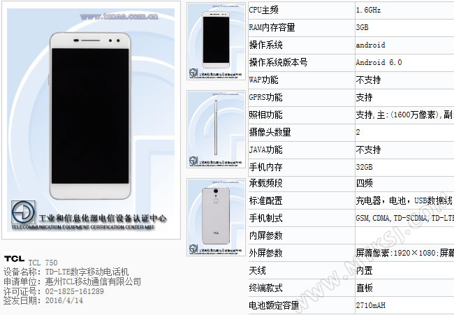 不日前,TCL 750曾在GFXbench上首秀,部份核心规格得到揭晓,日前TCL 750正式在国内首秀,该机已出现在了工信部网站上,预示着该机很快就会在国内发布上市。 入网信息公布的参数和之前跑分平台的大致相同,TCL 750会采用5.2英寸1080P分辨率显示屏,拥有3G RAM+32G ROM内存和800万+1600万像素摄像头,运行Android 6.0系统。处理器主频率微有差异,入网资料为1.6GHz主频率八核,但是结合之前曝光的信息可以确认,TCL 750应搭载的是1.8GHz主频的MTK6755m。 本文来自MTK手机网http://www.mtksj.com 另外一些此前未曾揭晓的规格也得到公开,TCL 750内置2710mAh电池,能支持全网通网络。并且,如乐玩2C一样,TCL 750是一款支持指纹识别技术的产品,指纹模块位于背部主摄像头下方。 此外,TCL 750的外观首次披露出来,预计是双面玻璃+金属中框的设计,有非常纤薄的身材,尺寸为145.8×71.4×7mm,颜色有金、白双色,整机设计风格给人以简约感。 让人遗憾的是,TCL通讯官方目前还没有公布一丁点儿关于这款新品的信息,但是结合750的整体规格推测,该机有可能是TCL新一代明星旗舰级产品。 ![]() 从背部的 本文来自MTK手机网http://www.mtksj.com