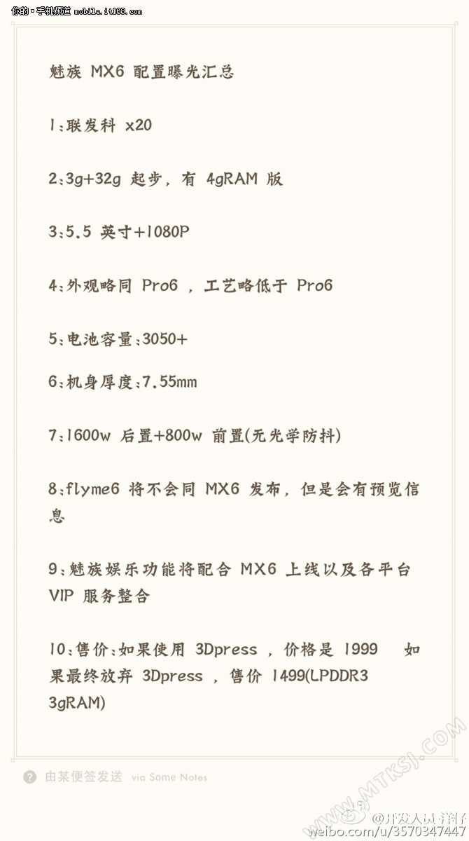 另者,也有网友整理了魅族MX6已知的部份规格信息,如同MX4/MX5, 魅族MX6依然会采用联发科解决方案,搭载的便是helio X20/MT6797十核处理器,或许有3G RAM、4G RAM两种内存版本,可能采用5.5英寸1080P屏幕、800万+1600万像素摄像头和超过3050mAh的电池。