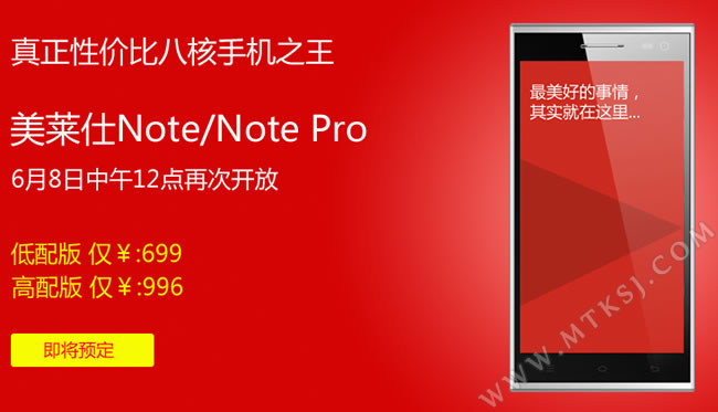 红米NOTE的上市,催生了不少与之针锋相对的产品,多款以NOTE为名的产品先后上市,美莱仕NOTE PRO就是其中一款,这部手机某些方面看上去比红米NOTE更具吸引眼球的能力,如能支持指纹识别、NFC等,集成了众多常用或不常用的功能,基础配置方面采用5.5英寸720P屏+八核+2G/16G内存和1300万像素等配置,售价为996元。 如今它的低配配也来了,低配版NOTE PRO命名为美莱仕NOTE,完整的延续了高配版的设计,规格低了不少,当然价格也更低。 美莱仕NOTE同样是5.5英寸的屏幕,换成了qHD级别960*540的分辨率,处理器采用了主流的MT6582四核,有1GB运行内存和8GB的存储空间,拍照规格下调至前200万后800万像素的组合。由于150*77*7.5mm的尺寸不变,该机的电池容量还是3200毫安,提供了黑、白两种颜色。 本文来自MTK手机网http://www.mtksj.com 如果只是上方的参数,在配置同质化严重的当下并不起眼,该机能吸引到人的地方是保留了高配版的不少特色功能,首先仍可支持指纹识别,通过录入指纹实现解锁,更加安全,此外还可支持OTG功能,进行更多的扩展,搭载了最新的Android 4.4kitkat系统也算卖点之一,目前升级到Android 4.4的MTK平台机型还是比较少的。 低配版NOTE的定价是699元,将会在6月8日中午12点首发预售,售996元的高配版也会同时开卖。 ![]() ![]()