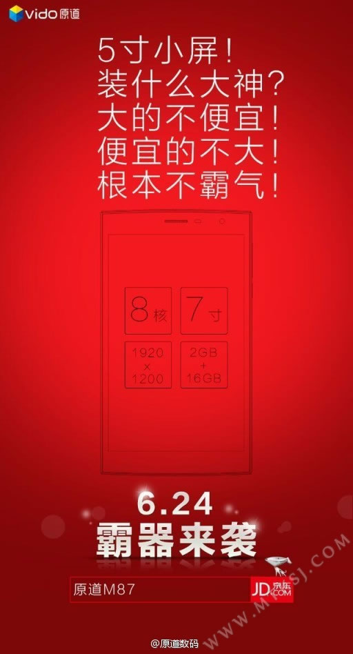 原道首款内置八核处理器的通话产品型号为M87,官方微博最新透露出来的消息显示,M87正式上市时间定于非常热闹的6月24日,首发渠道则选定了京东商城。 原道M87的规格可以说十分的主流,其采用了7英寸1920*1200分辨率的LTPS屏幕,处理器是1.7GHz主频率的MT6592八核,内置2GB DDR3 RAM+16G ROM内存,拍照规格是前500万、后800万像素的组合,电池容量为3000毫安,可支持WCDMA/GSM双网络,蓝牙、WIFI以及GPS等功能一样不缺,常用的传感器也有搭载。外观部份,原道M87有硬朗阳刚的造型,配色也丰富,有黑色、白色与土豪金,厚约8mm左右。 本文来自MTK手机网http://www.mtksj.com 这款产品迟迟未上市的原因显然就是重新更换设计所导致的,重新亮相的M87设计够个性,并有7英寸八核平板手机中的标准配置,预计售价可能同样是千元左右,有兴趣的网友可关注官方的首发活动。 ![]() 原道M87真机照片: ![]() ![]() 图片由@Tengar糖果原创 转载MTK手机网原创文章请保留链接:7英寸八核新品 原道M87首发时间曝光 |
