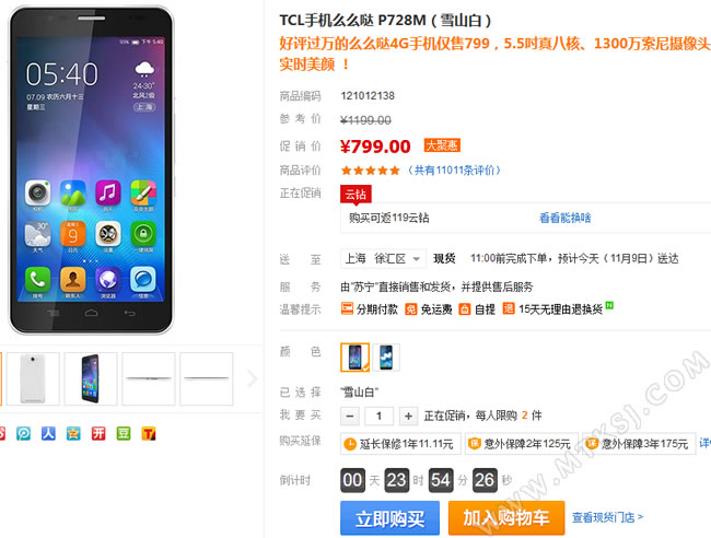 TCL旗下当前的明星产品么么哒4G版上市报899元,平时售999元是很常见的事,而近日却首度出现降价,该机的首发平板苏宁易购报出799元的促销价,想换一部4G产品入门的用户值得考虑。 么么哒4G版基于3G版升级而来,可以支持4G网络(移动TD-LTE),兼容TD-SCDMA与GSM网络,采用单SIM卡设计,所搭载的解决方案是MT6592M+MT6290。拍照部份也有升级,看规格比S720T要强的多,么么哒4G版/P728M装备了索尼第二堆栈式CMOS-IMX214,支持独立测光,前置仍然是500万像素。 本文来自MTK手机网http://www.mtksj.com 除了这些明显的升级,么么哒4G版运行Android 4.4系统,由乐蛙OS5完美定制而来,拥有1G RAM与8G ROM内存、3300毫安大电池和5.5英寸720P全贴合屏幕,并支持OTG、双麦降噪、双频WIFI、电子罗盘以及Hotknot技术。 ![]()